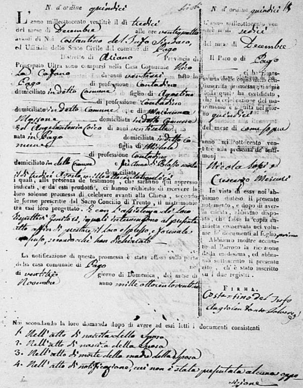 Nicola Cafano were married on December 16, 1823 in Pago Veiano, Benevento, Campania, Italy. She died on August 4, 1829, at age ~33, in Pago Veiano, Benevento, Campania, Italy.