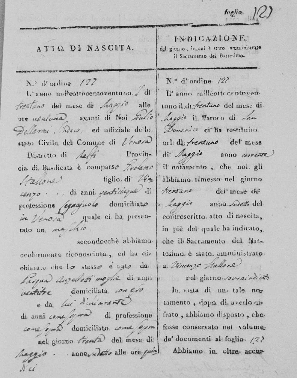 Vincenzo Stallone was born on May 30, 1821 in Venosa, Potenza, Basilicata, Italy. He died.