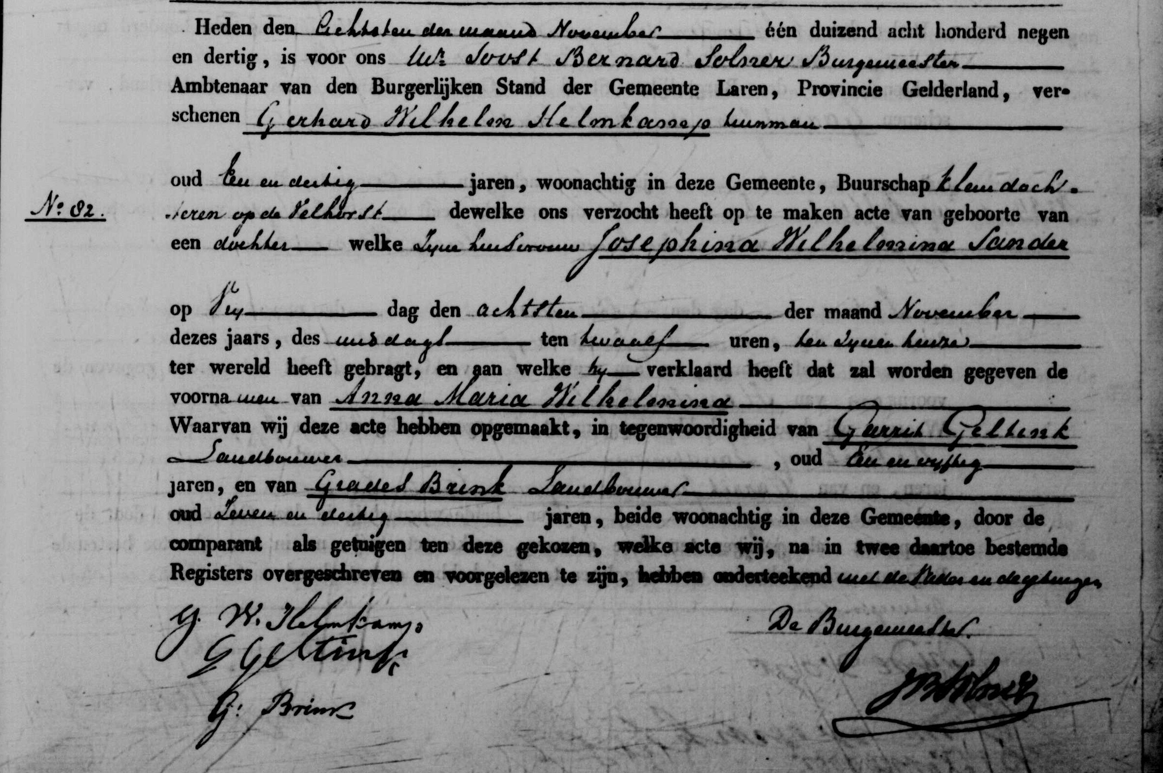 Anna Maria Wilhelmina Helmkamp was born on November 8, 1839 in Laren, Lochem, Gelderland, Netherlands. She and