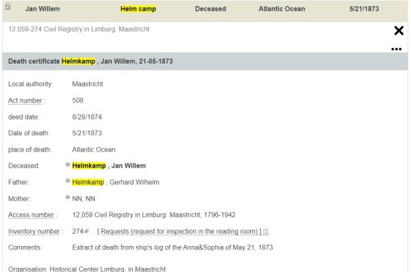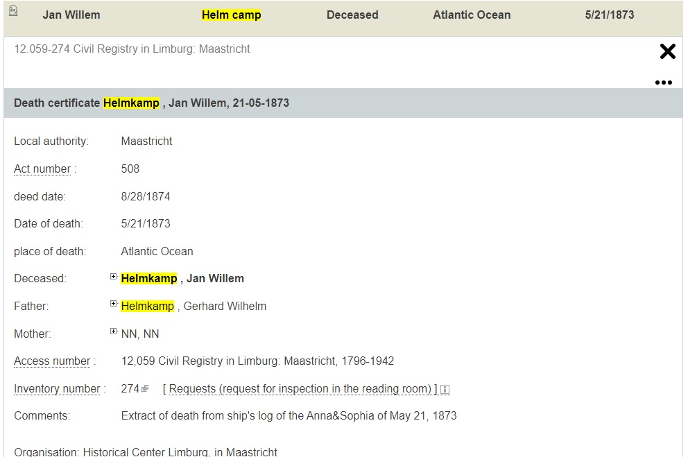 | Son | Jan Wilhelm Helmkamp Born: March 13, 1841, Died: May 21, 1873 |