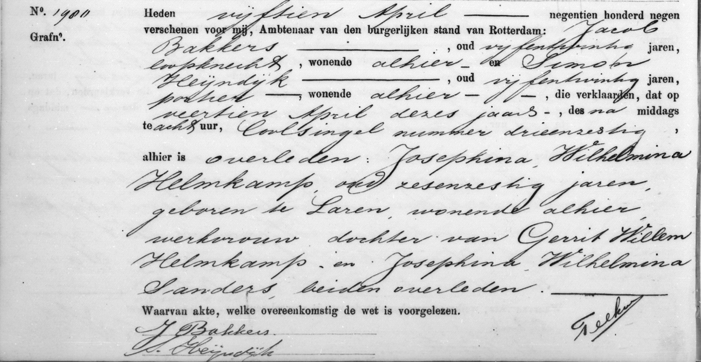 Josephina Wilhelmina Helmkamp was born on October 12, 1842 in Laren, Lochem, Gelderland, Netherlands. She died on April 14, 1909, at age 66, in Rotterdam, South Holland, Netherlands.
