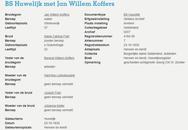 Jan Willem Koffers were married on October 23, 1830 in S-Gravenhage, Haaglanden, South Holland, Netherlands. She died.